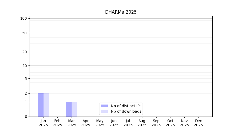 Number of downloads for experiment package DHARMa, year by year, from 2025 back to 2014 (years with no downloads are omitted):