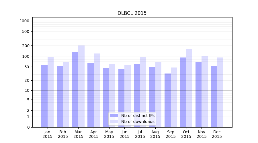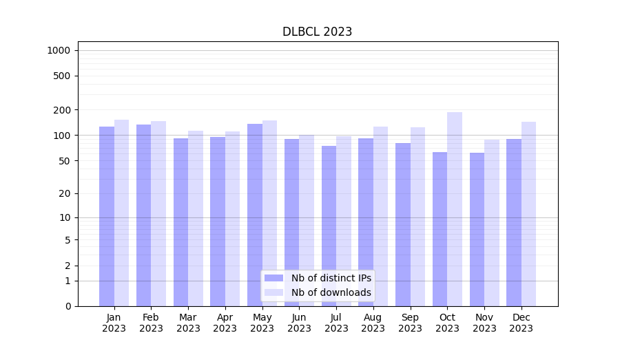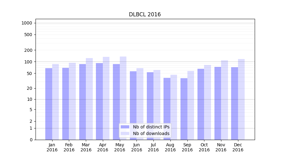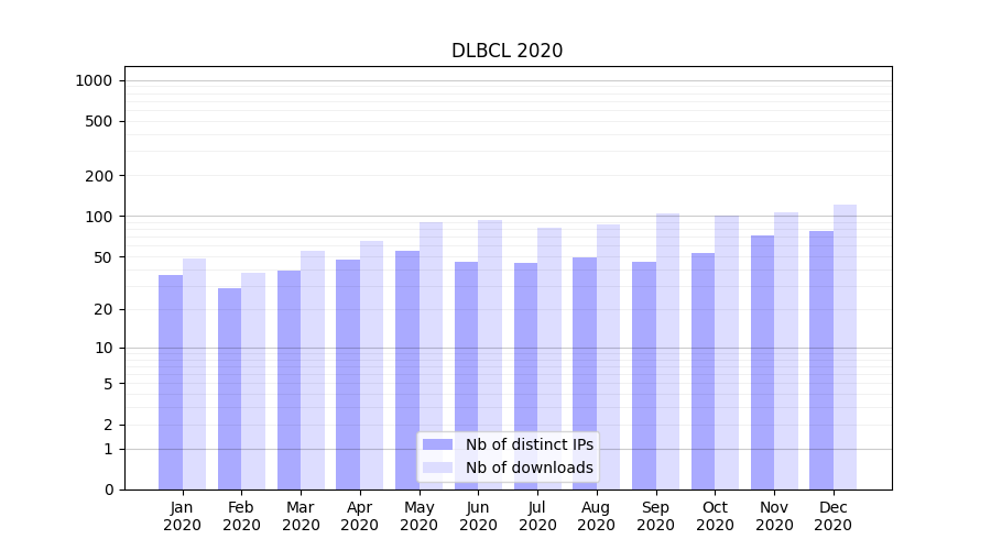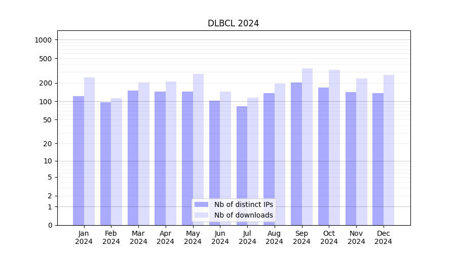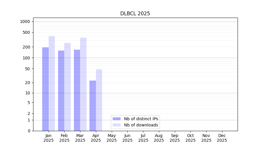 Number of downloads for experiment package DLBCL, year by year, from 2025 back to 2014 (years with no downloads are omitted):