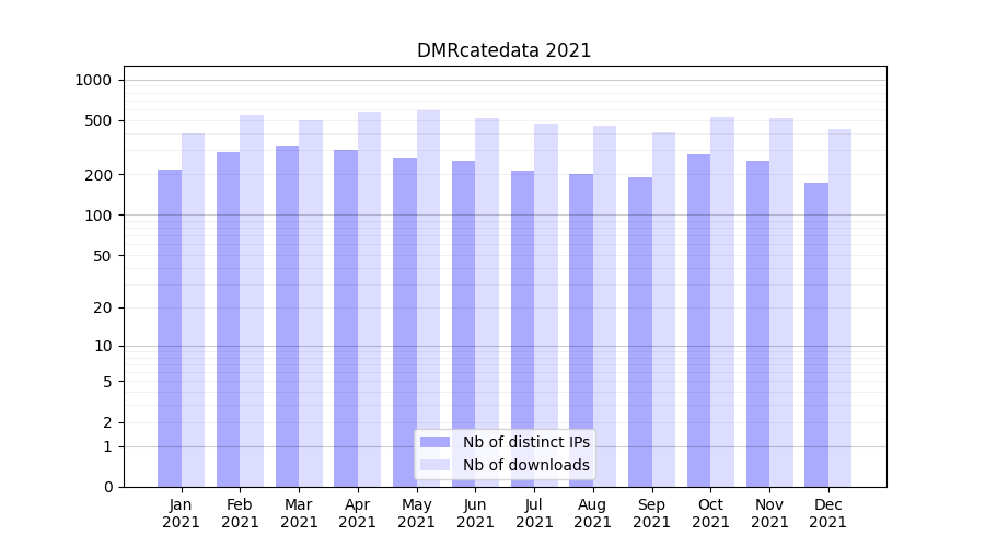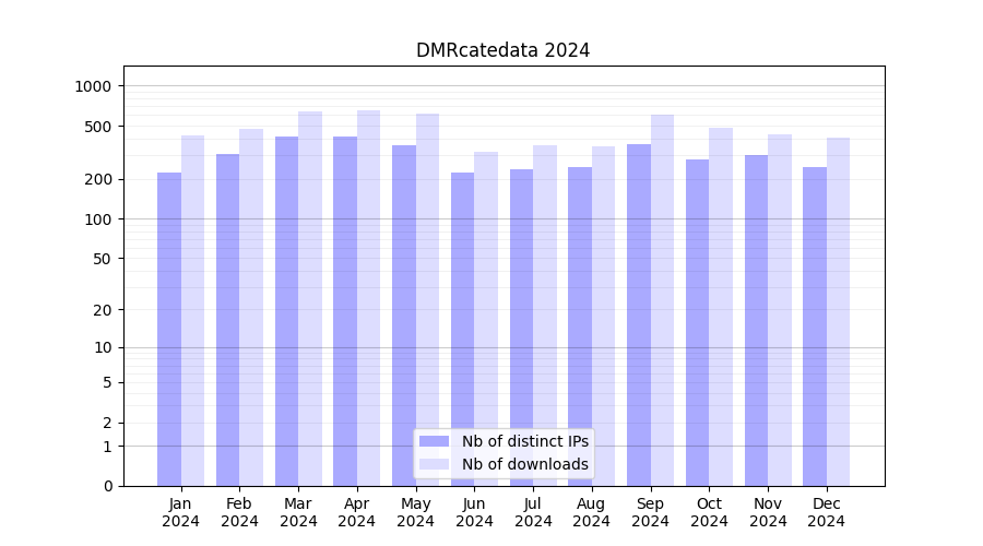 Number of downloads for experiment package DMRcatedata, year by year, from 2025 back to 2014 (years with no downloads are omitted):