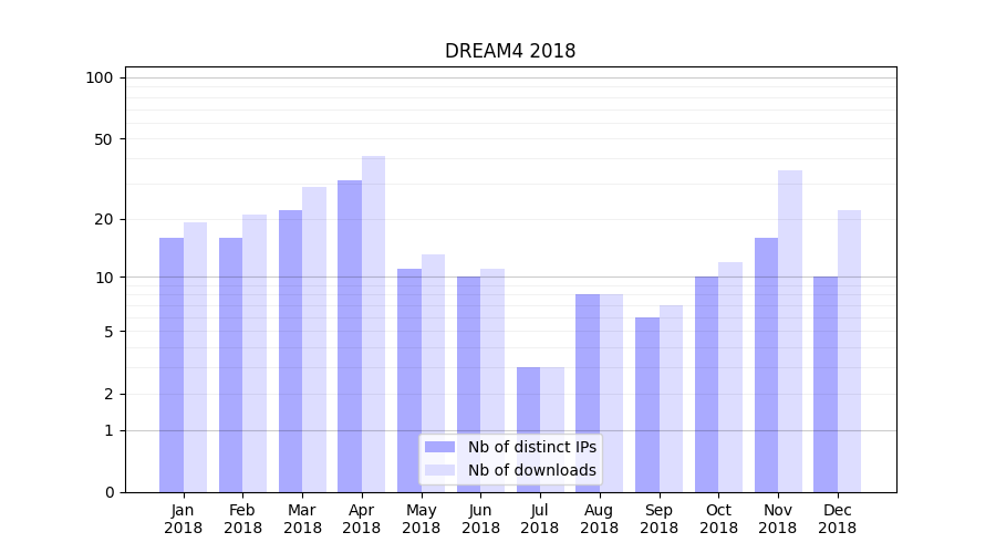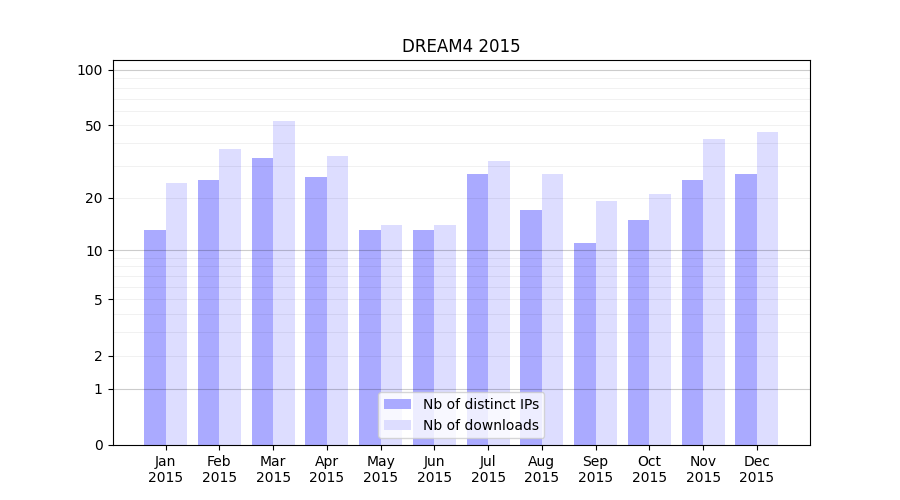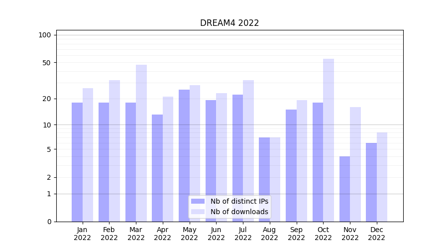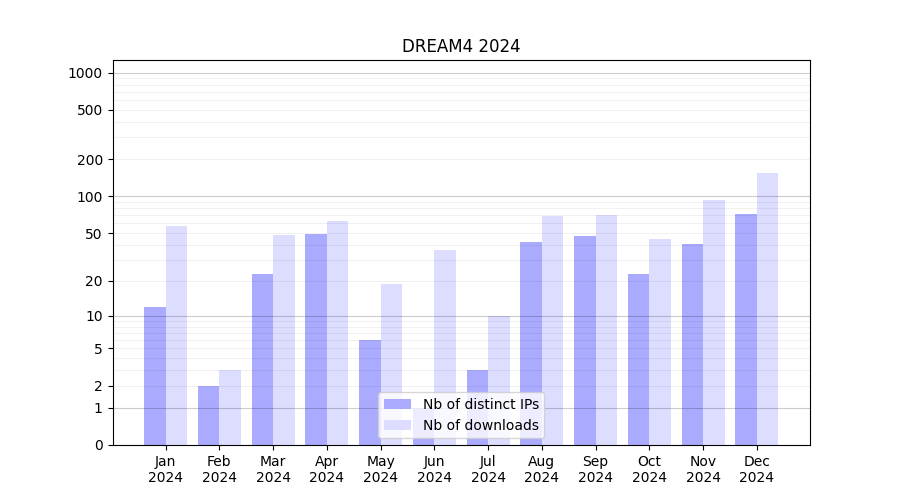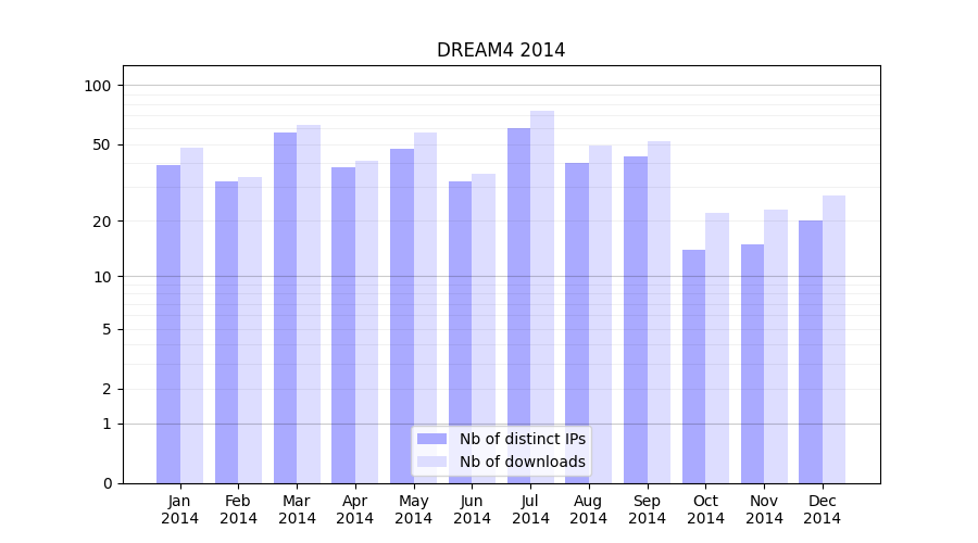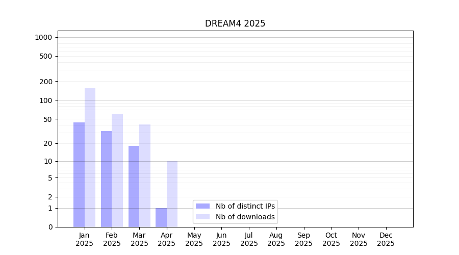 Number of downloads for experiment package DREAM4, year by year, from 2025 back to 2014 (years with no downloads are omitted):