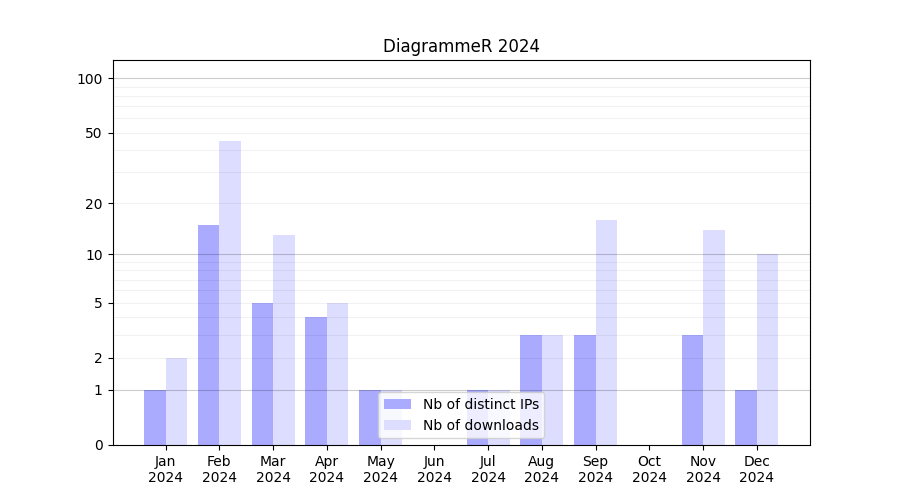 Number of downloads for experiment package DiagrammeR, year by year, from 2025 back to 2014 (years with no downloads are omitted):