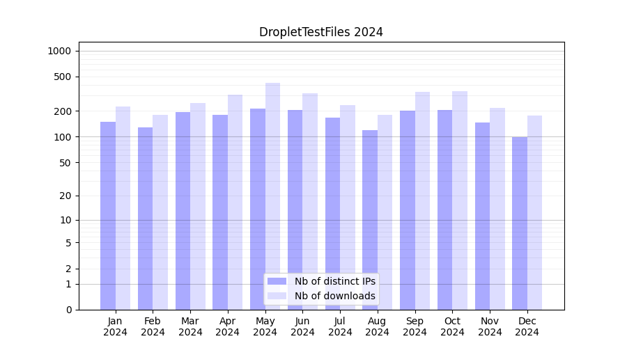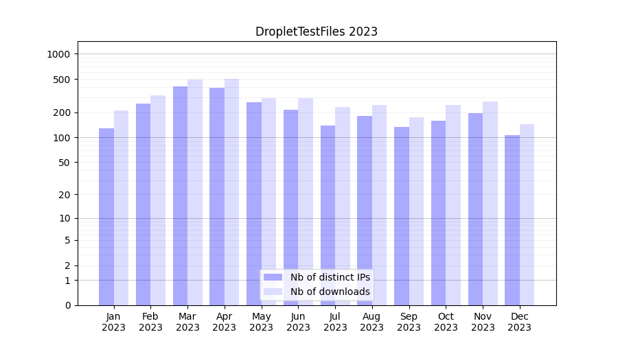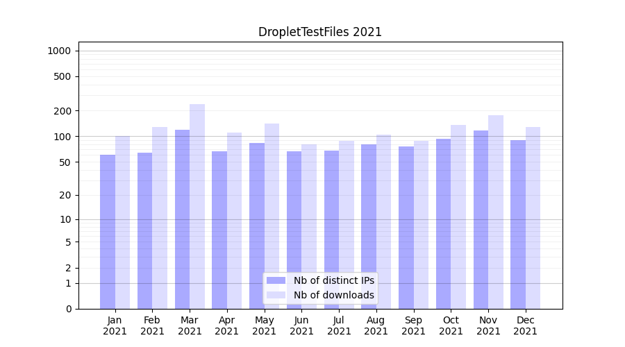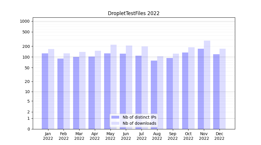 Number of downloads for experiment package DropletTestFiles, year by year, from 2025 back to 2014 (years with no downloads are omitted):