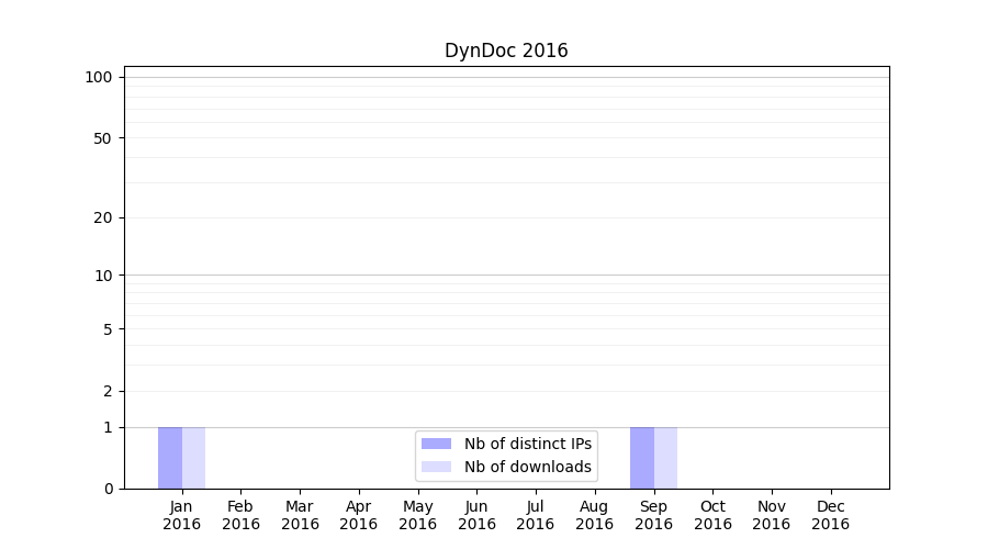 Number of downloads for experiment package DynDoc, year by year, from 2025 back to 2014 (years with no downloads are omitted):