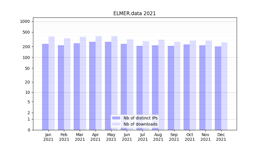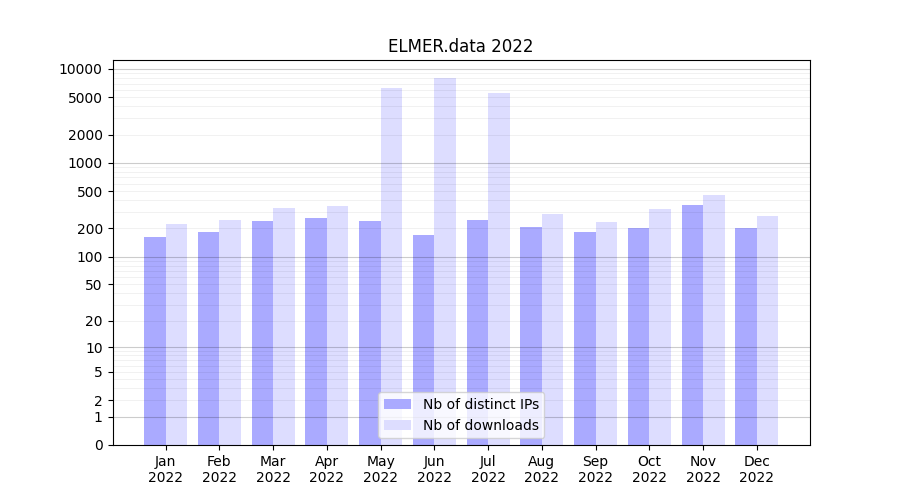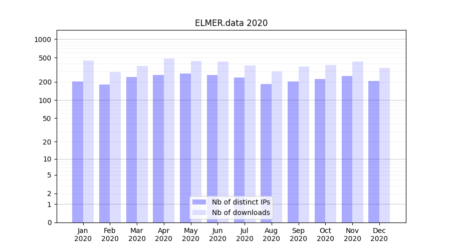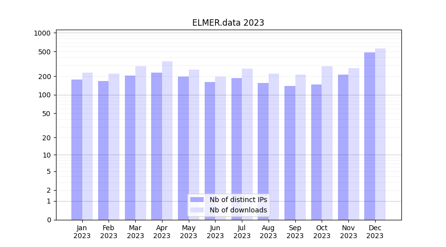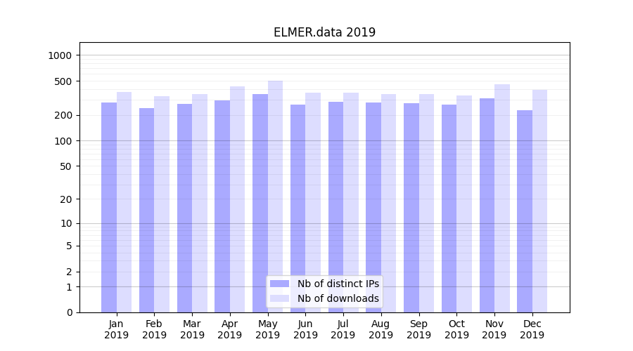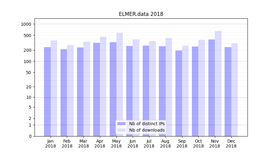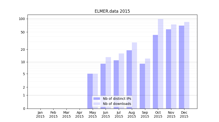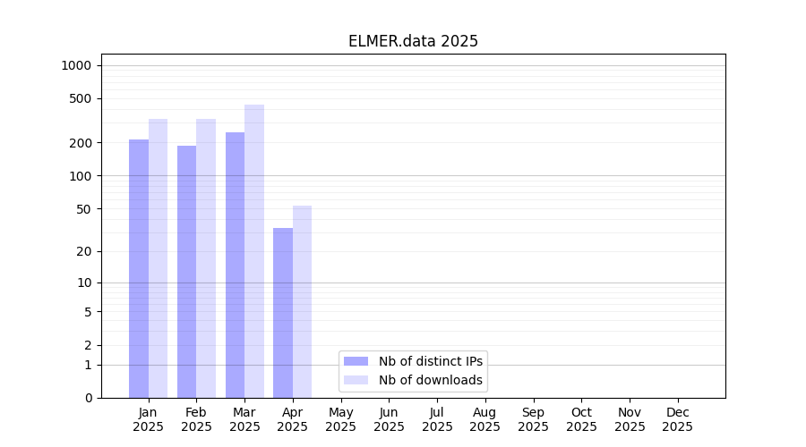 Number of downloads for experiment package ELMER.data, year by year, from 2025 back to 2014 (years with no downloads are omitted):