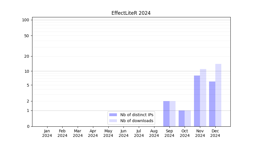 Number of downloads for experiment package EffectLiteR, year by year, from 2025 back to 2014 (years with no downloads are omitted):