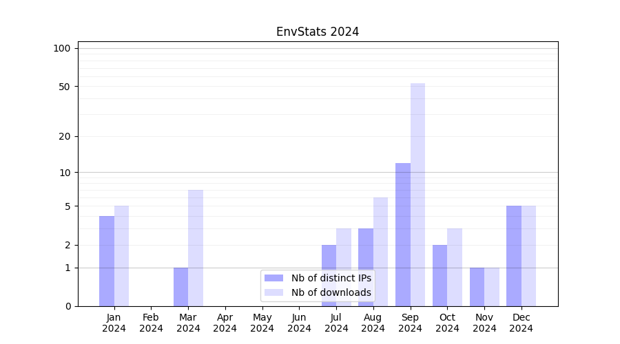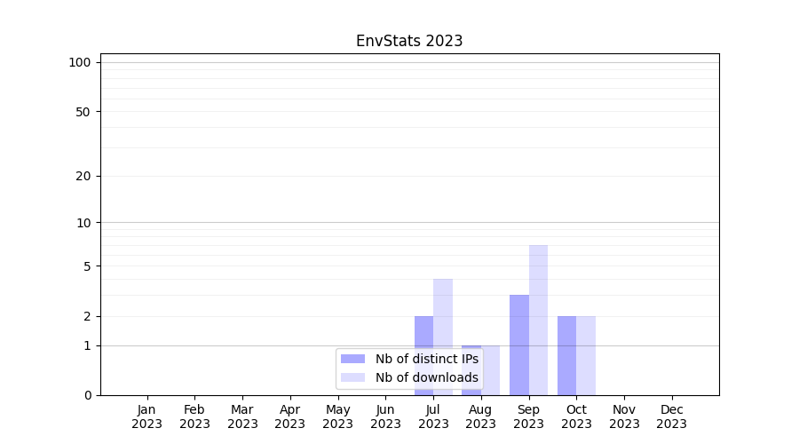 Number of downloads for experiment package EnvStats, year by year, from 2025 back to 2014 (years with no downloads are omitted):