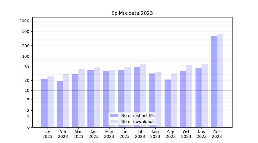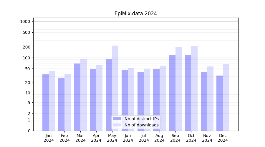Number of downloads for experiment package EpiMix.data, year by year, from 2025 back to 2014 (years with no downloads are omitted):