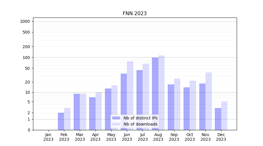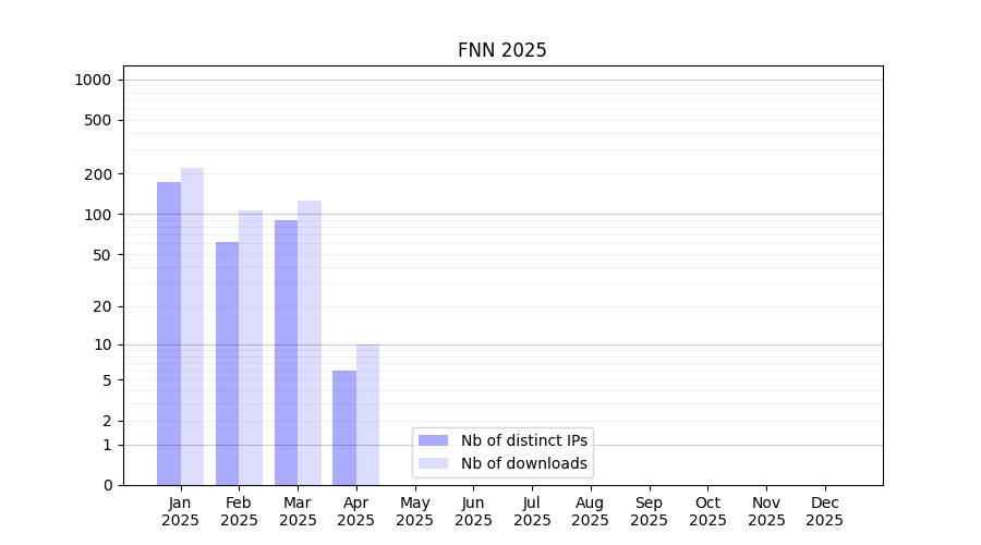 Number of downloads for experiment package FNN, year by year, from 2025 back to 2014 (years with no downloads are omitted):
