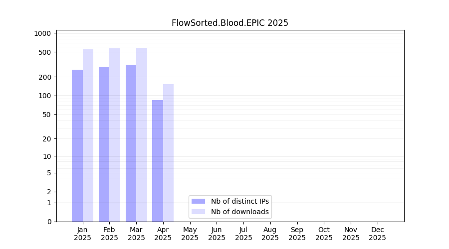 Number of downloads for experiment package FlowSorted.Blood.EPIC, year by year, from 2025 back to 2014 (years with no downloads are omitted):