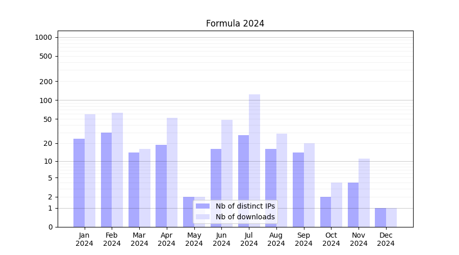 Number of downloads for experiment package Formula, year by year, from 2025 back to 2014 (years with no downloads are omitted):