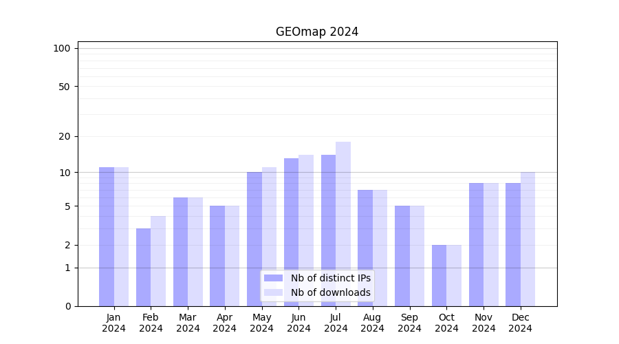Number of downloads for experiment package GEOmap, year by year, from 2025 back to 2014 (years with no downloads are omitted):