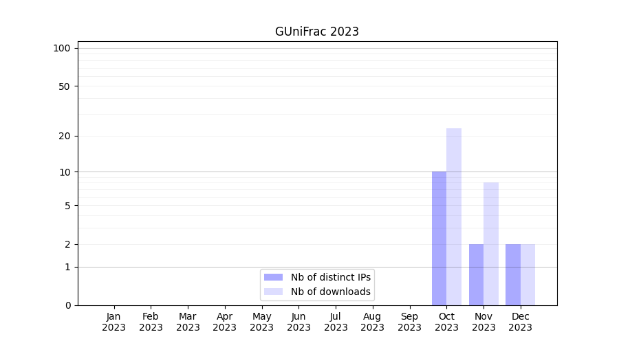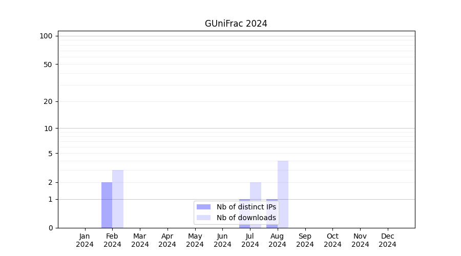 Number of downloads for experiment package GUniFrac, year by year, from 2025 back to 2014 (years with no downloads are omitted):