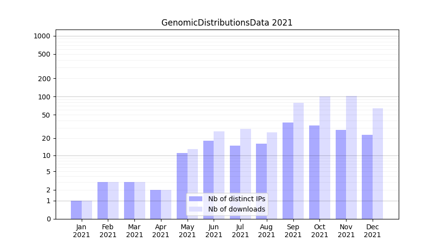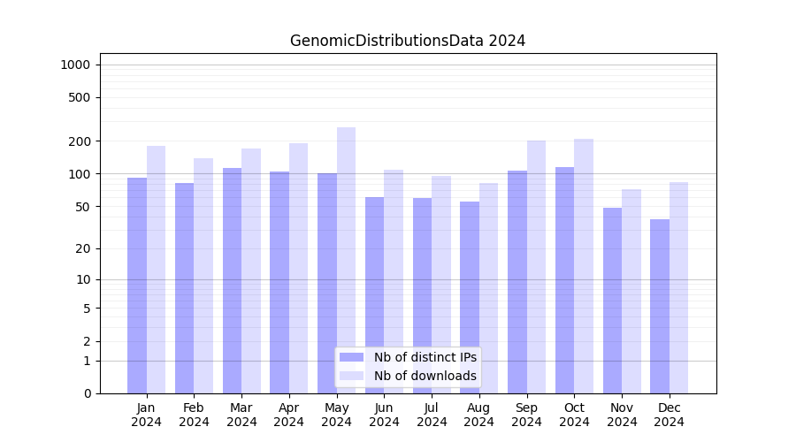 Number of downloads for experiment package GenomicDistributionsData, year by year, from 2025 back to 2014 (years with no downloads are omitted):