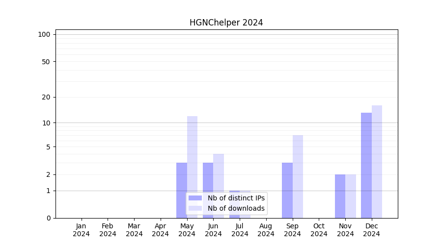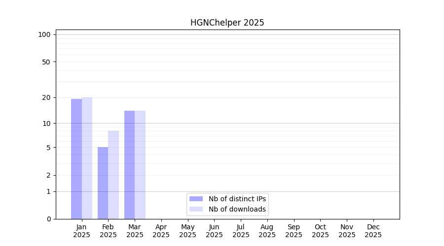 Number of downloads for experiment package HGNChelper, year by year, from 2025 back to 2014 (years with no downloads are omitted):