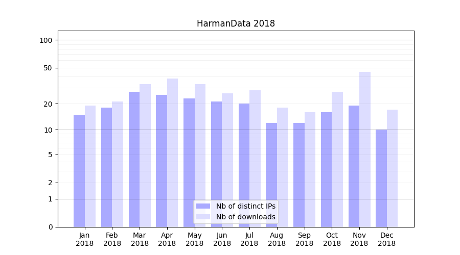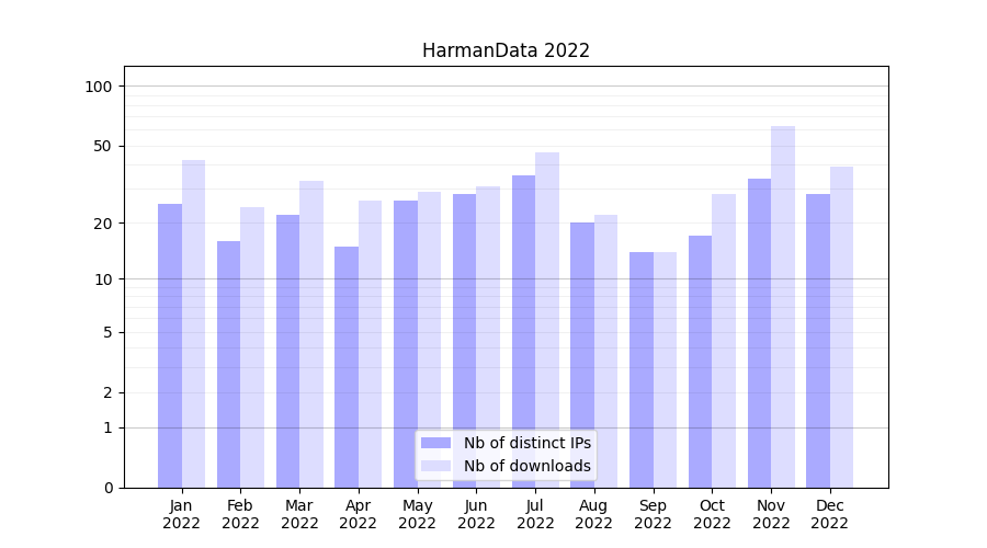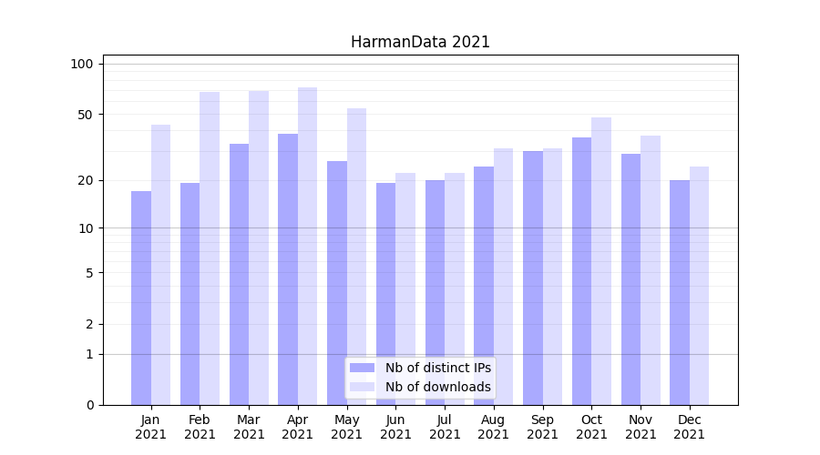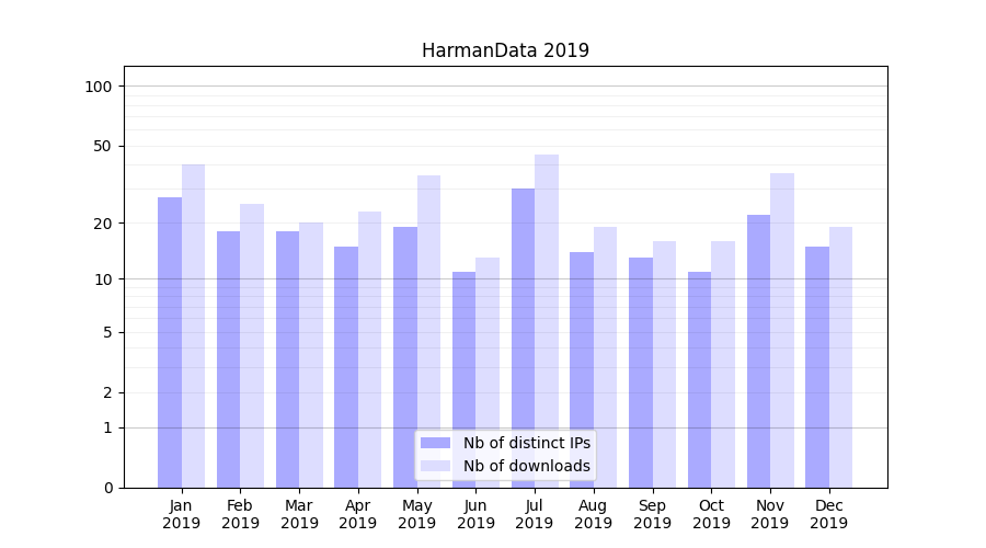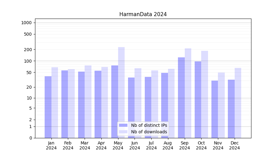 Number of downloads for experiment package HarmanData, year by year, from 2025 back to 2014 (years with no downloads are omitted):