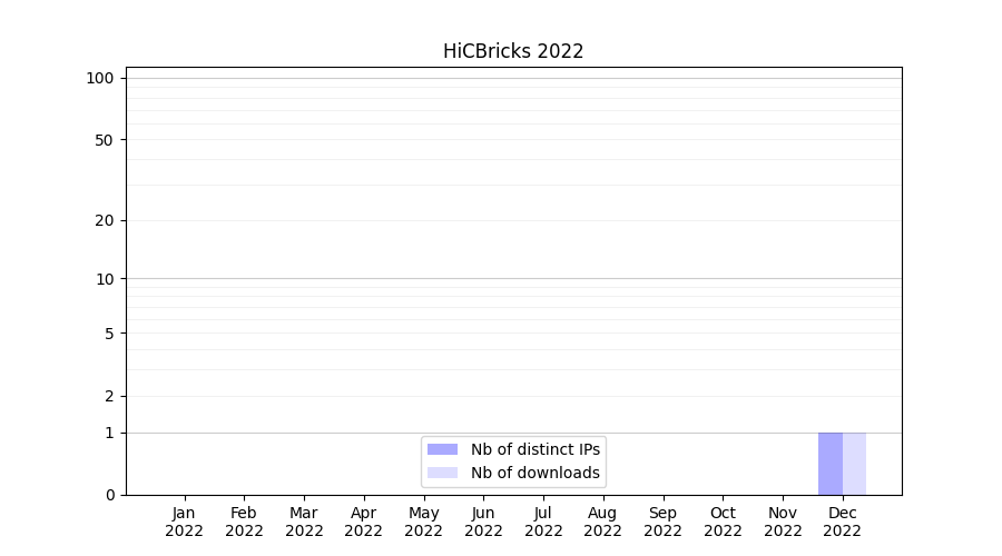 Number of downloads for experiment package HiCBricks, year by year, from 2025 back to 2014 (years with no downloads are omitted):