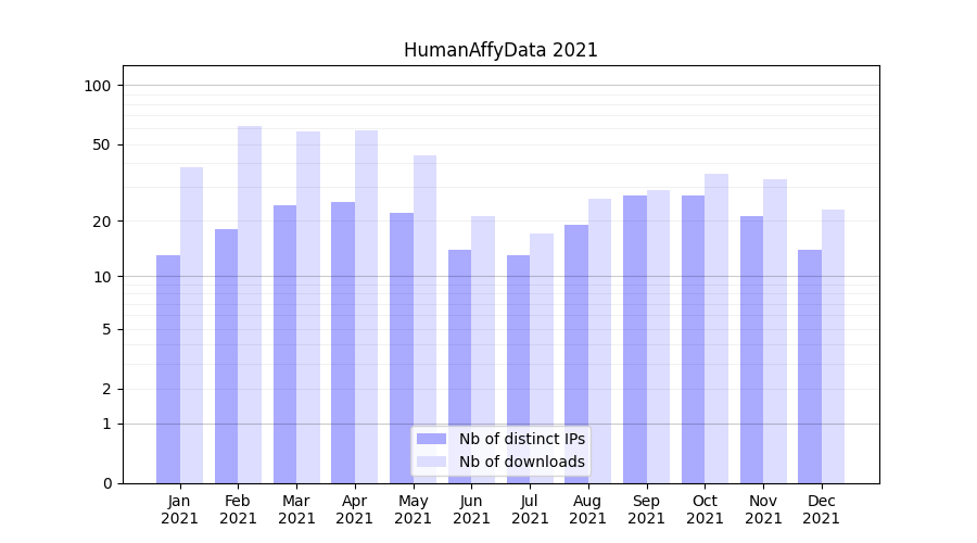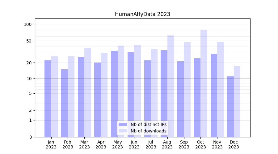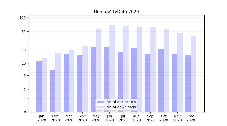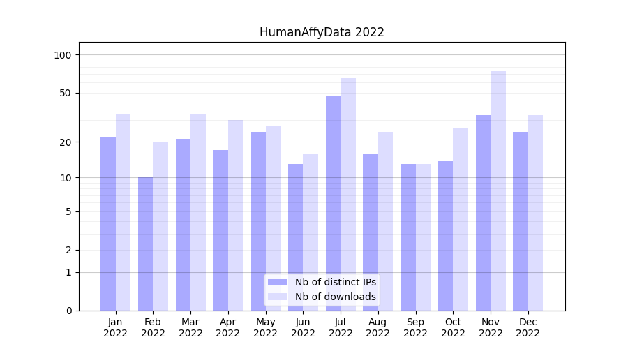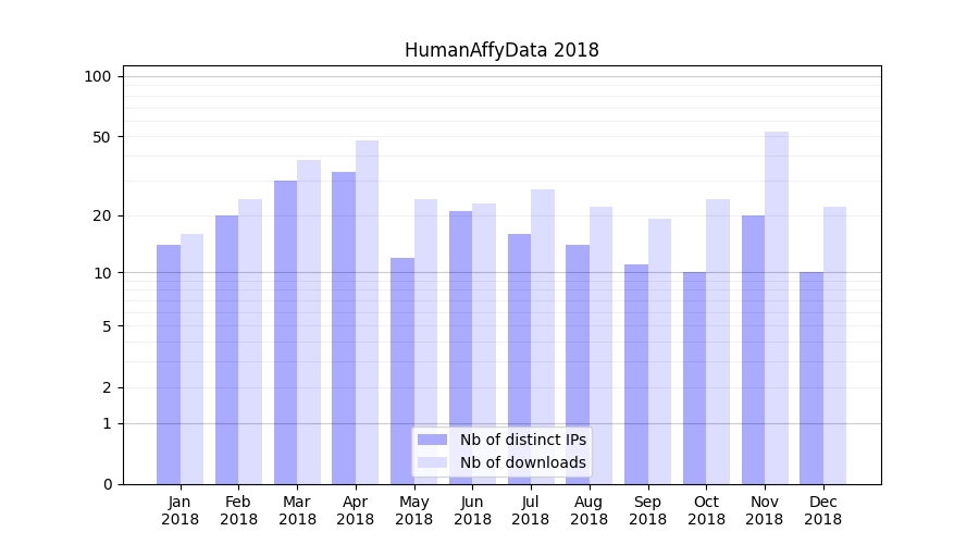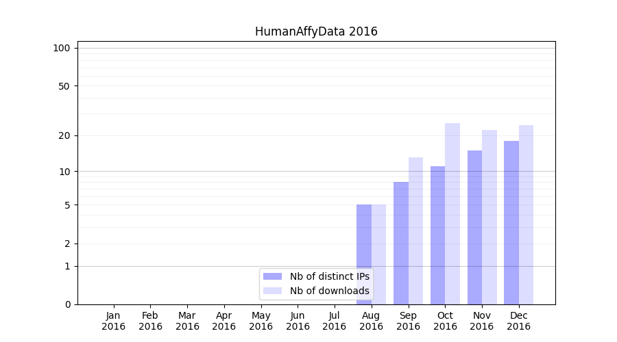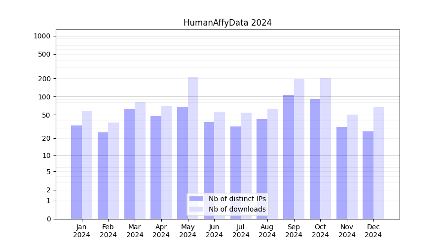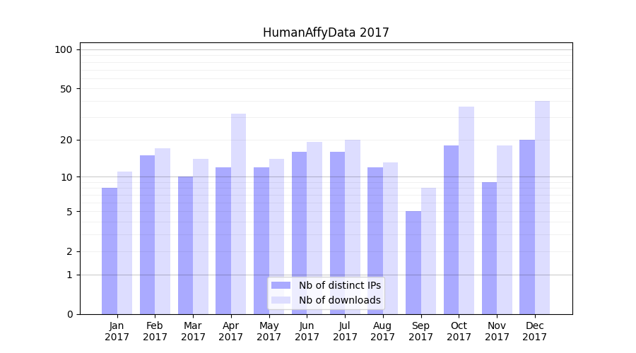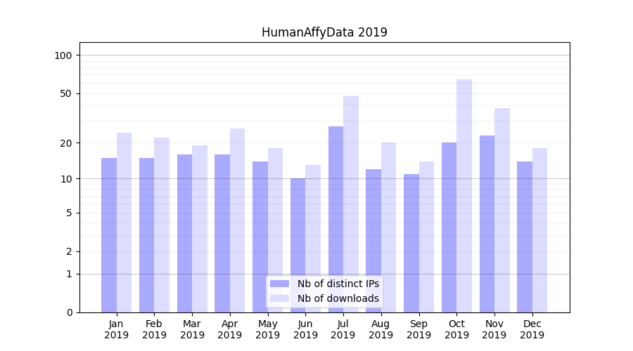 Number of downloads for experiment package HumanAffyData, year by year, from 2025 back to 2014 (years with no downloads are omitted):