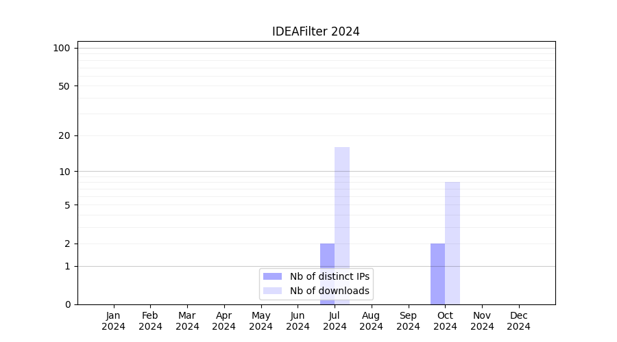 Number of downloads for experiment package IDEAFilter, year by year, from 2025 back to 2014 (years with no downloads are omitted):