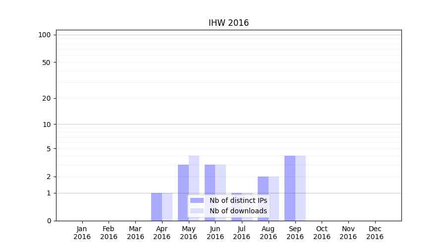 Number of downloads for experiment package IHW, year by year, from 2025 back to 2014 (years with no downloads are omitted):