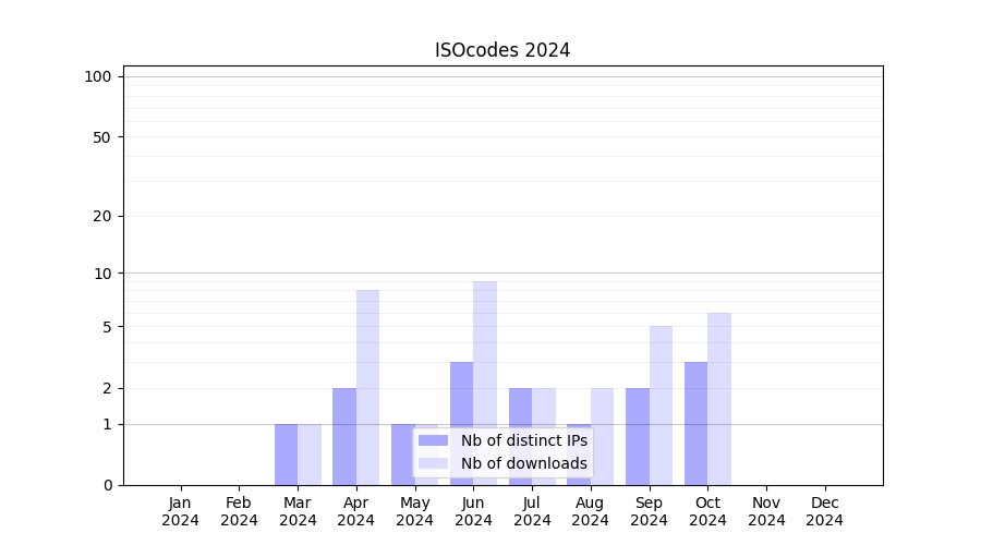 Number of downloads for experiment package ISOcodes, year by year, from 2025 back to 2014 (years with no downloads are omitted):