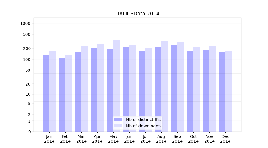 Number of downloads for experiment package ITALICSData, year by year, from 2025 back to 2014 (years with no downloads are omitted):