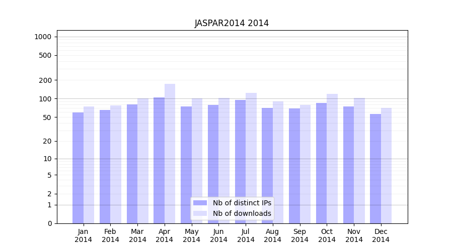 Number of downloads for experiment package JASPAR2014, year by year, from 2025 back to 2014 (years with no downloads are omitted):