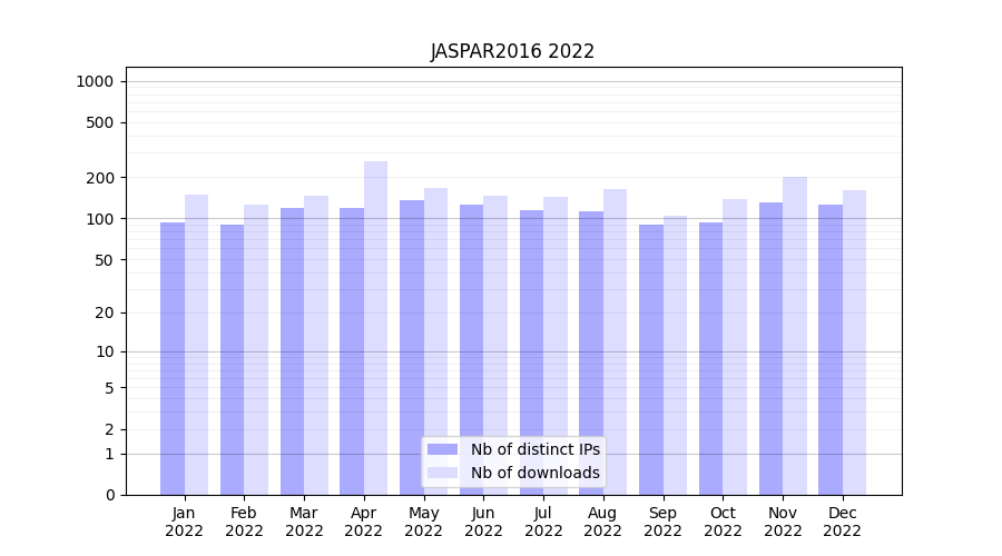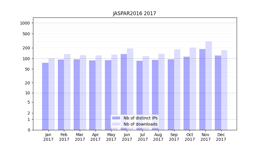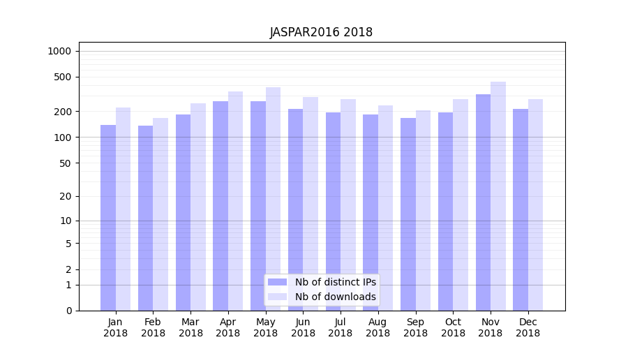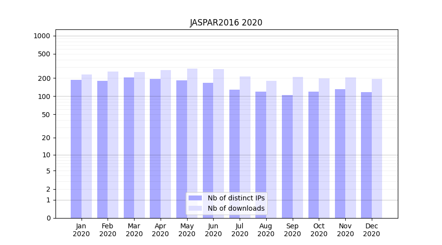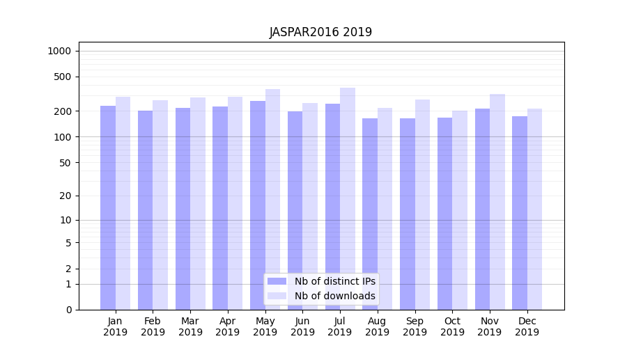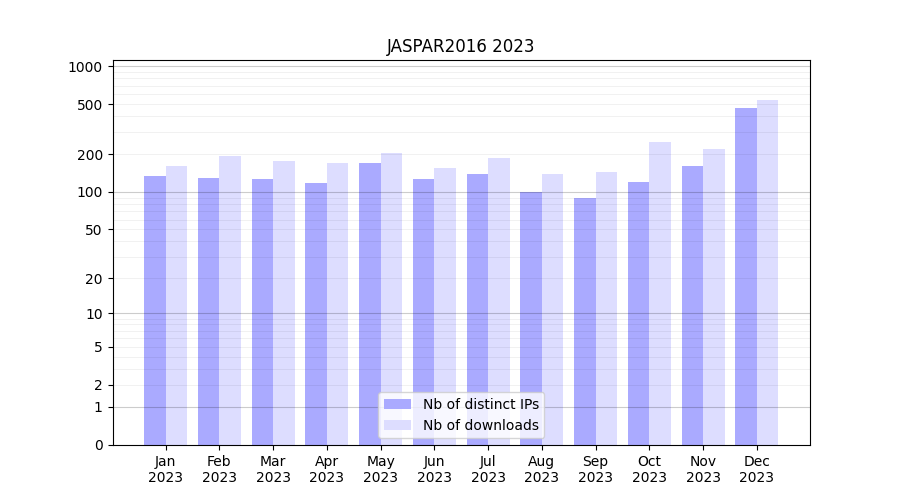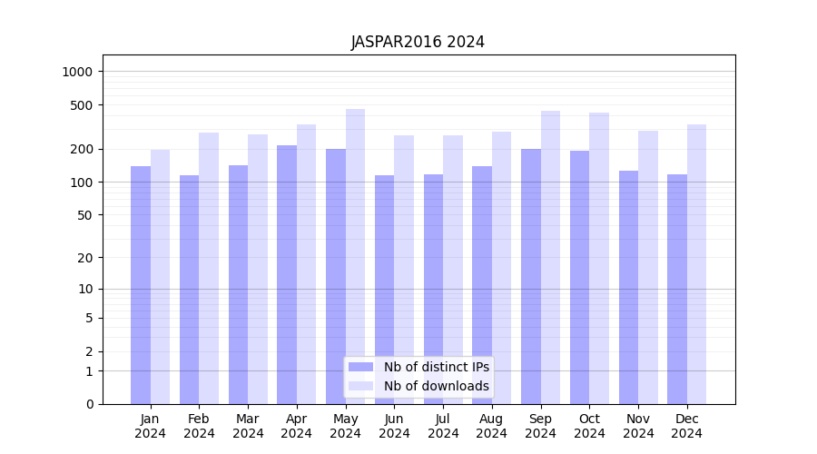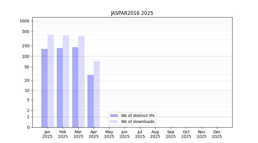 Number of downloads for experiment package JASPAR2016, year by year, from 2025 back to 2014 (years with no downloads are omitted):