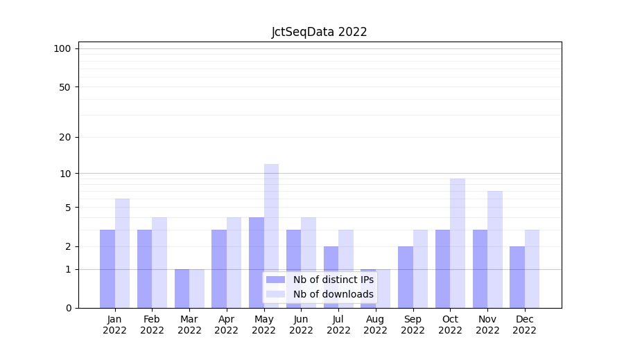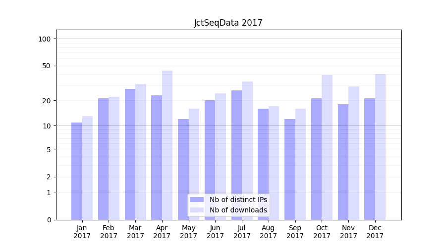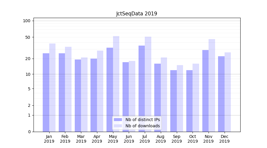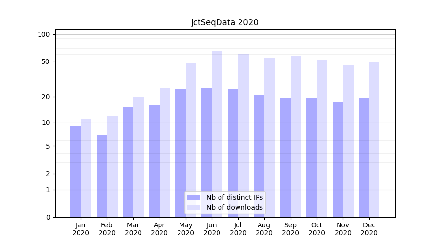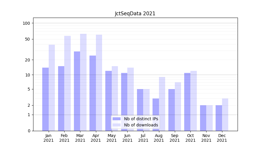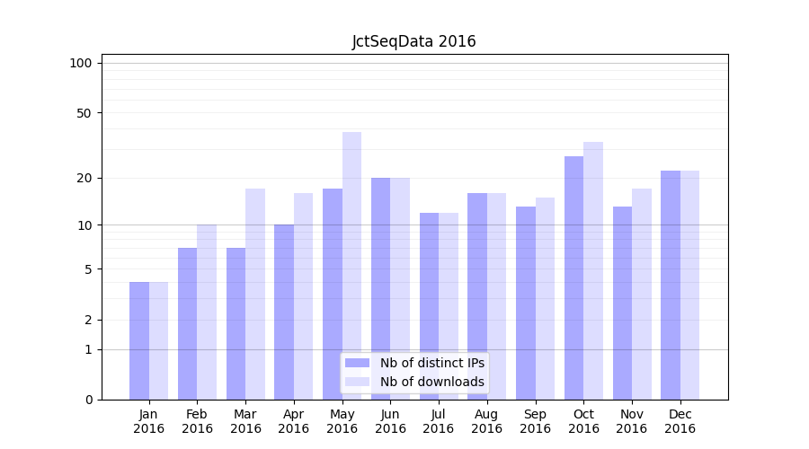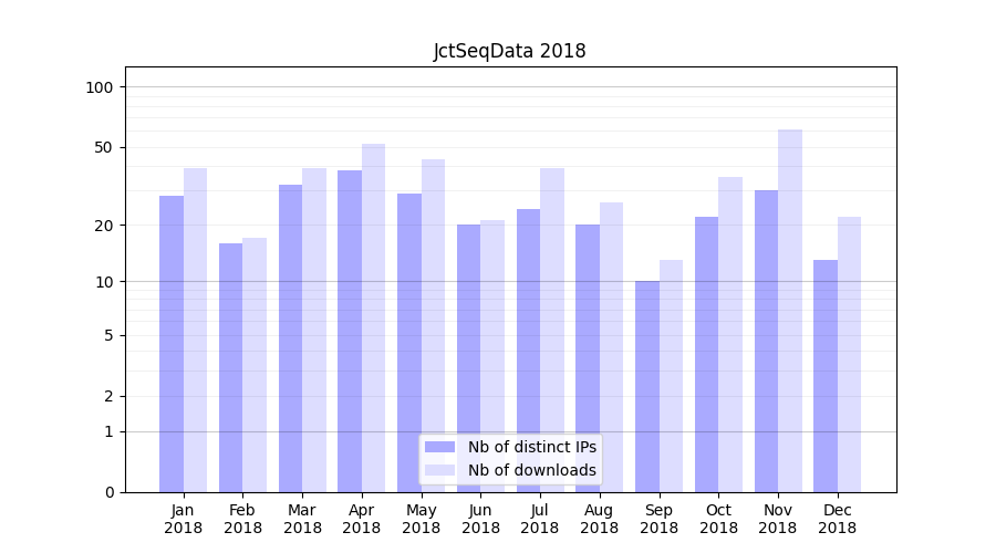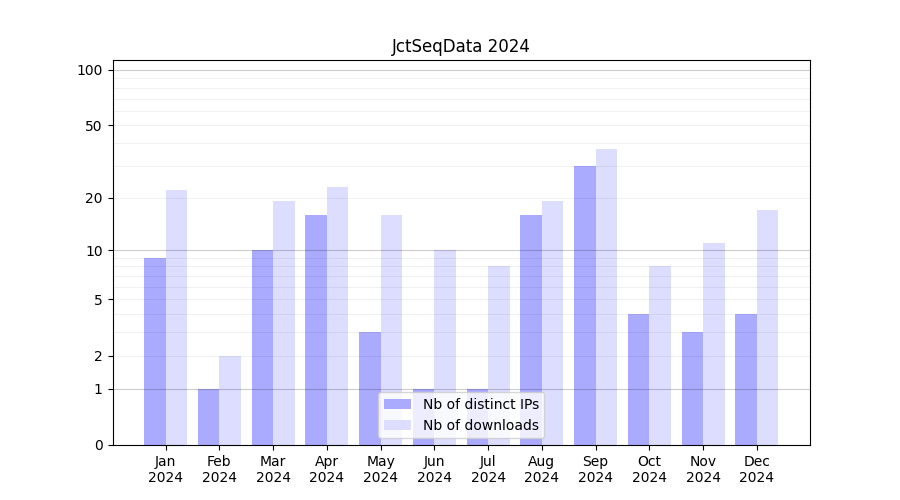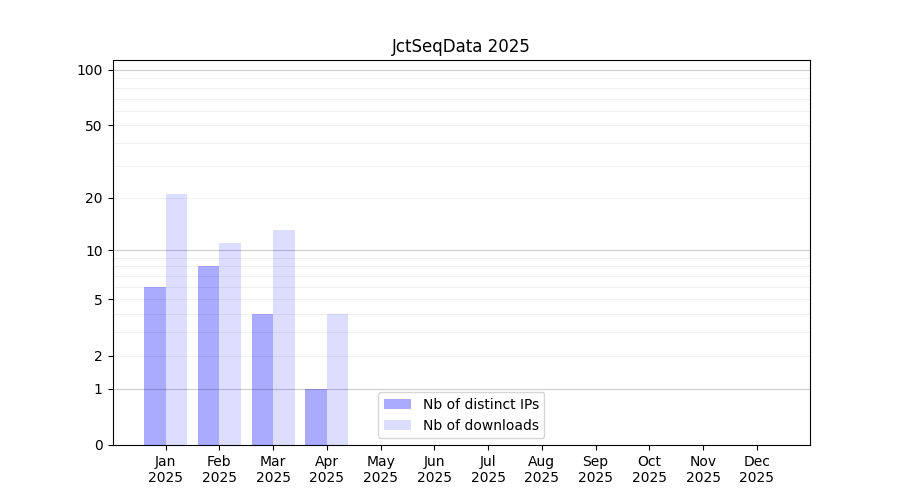 Number of downloads for experiment package JctSeqData, year by year, from 2025 back to 2014 (years with no downloads are omitted):