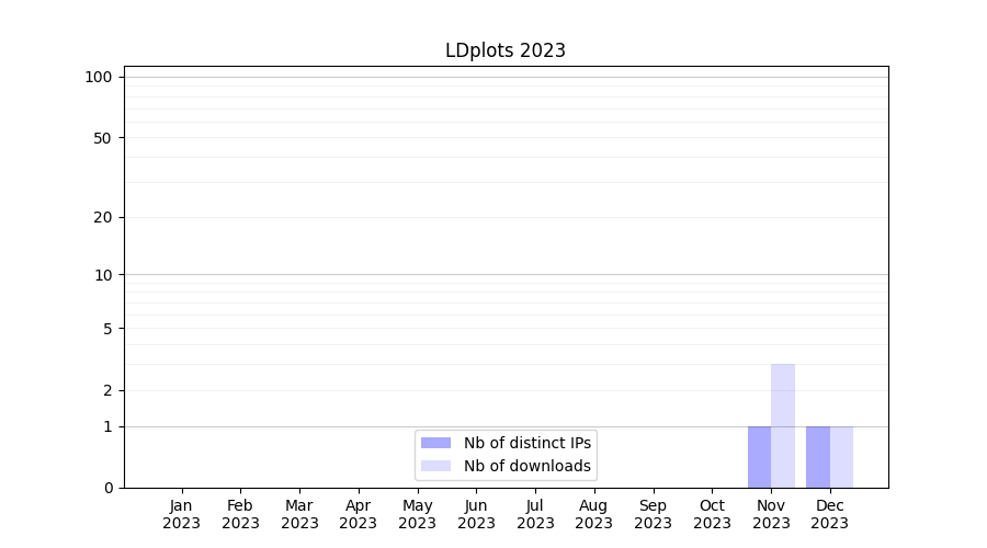Number of downloads for experiment package LDplots, year by year, from 2025 back to 2014 (years with no downloads are omitted):
