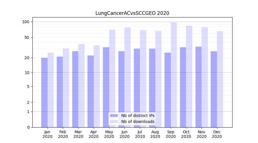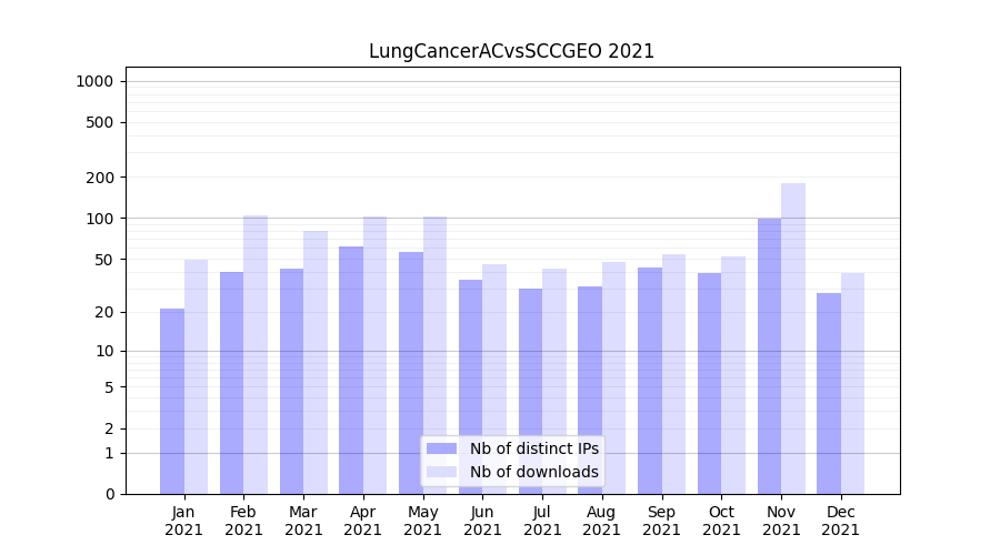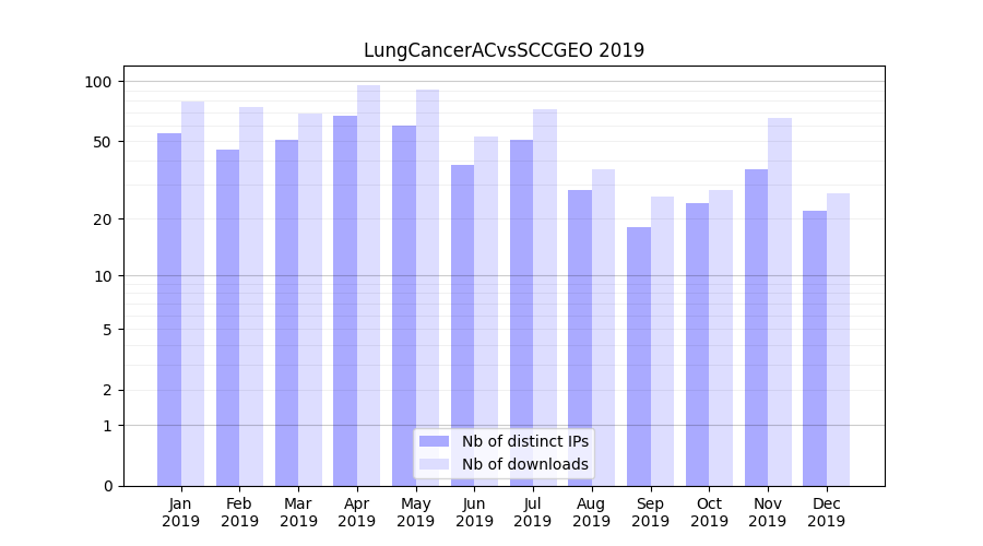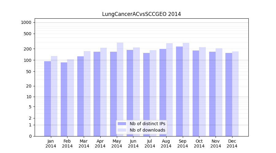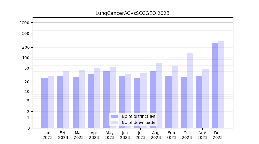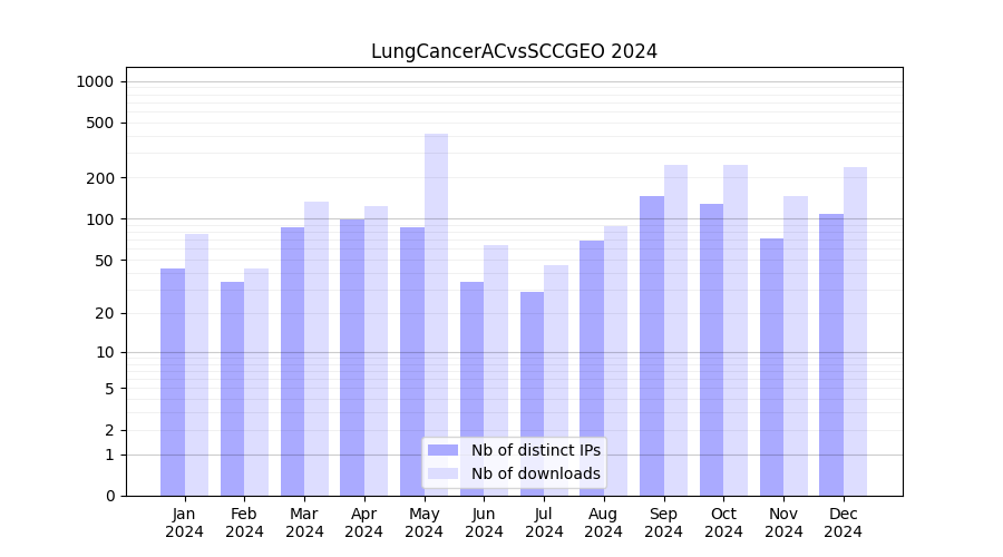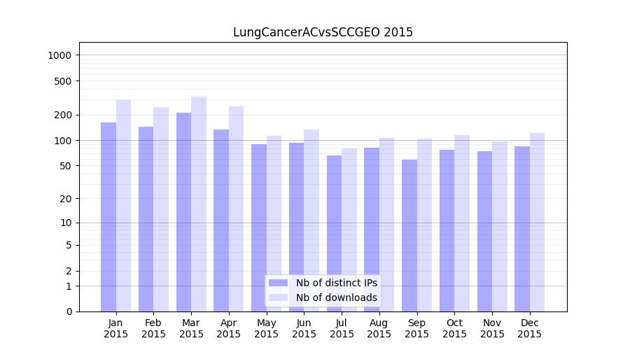 Number of downloads for experiment package LungCancerACvsSCCGEO, year by year, from 2025 back to 2014 (years with no downloads are omitted):