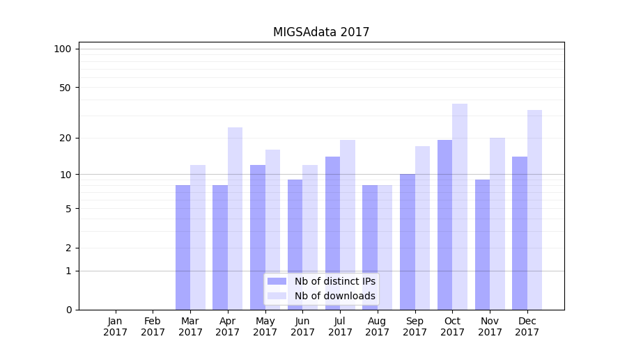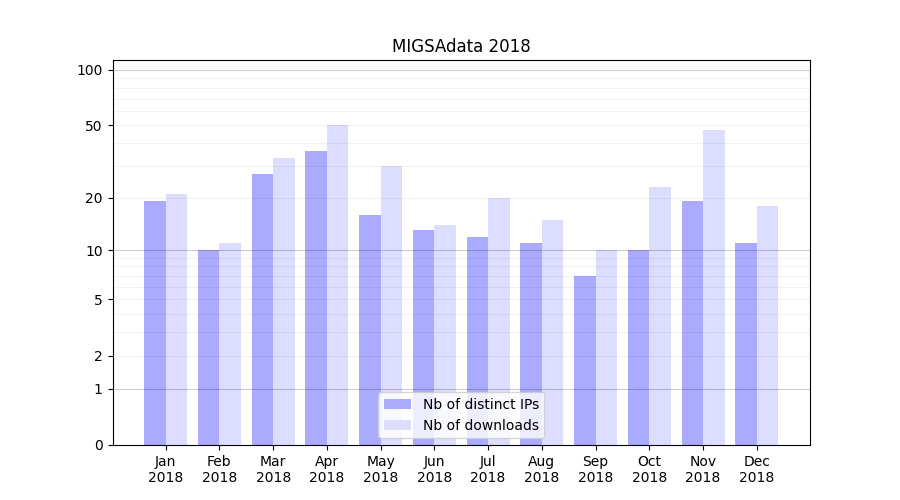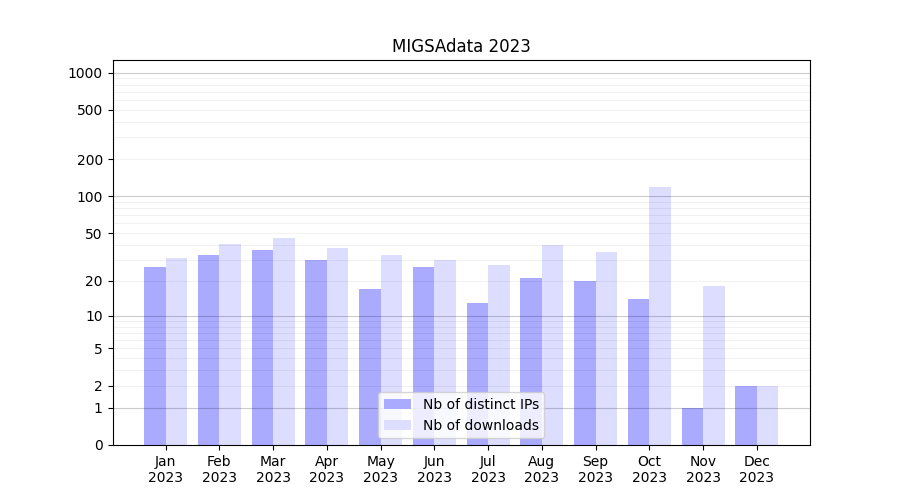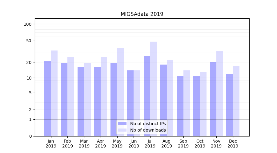Number of downloads for experiment package MIGSAdata, year by year, from 2025 back to 2014 (years with no downloads are omitted):