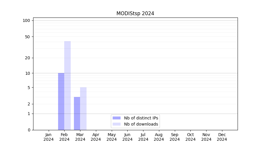 Number of downloads for experiment package MODIStsp, year by year, from 2025 back to 2014 (years with no downloads are omitted):
