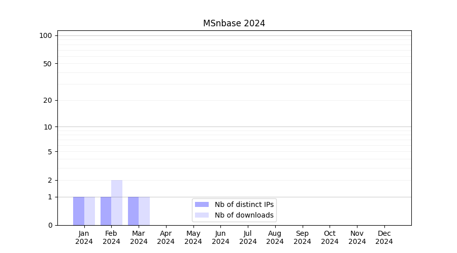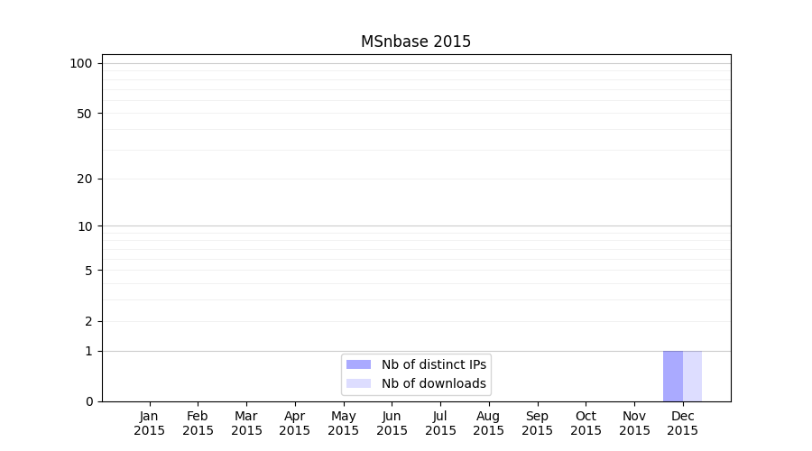 Number of downloads for experiment package MSnbase, year by year, from 2025 back to 2014 (years with no downloads are omitted):