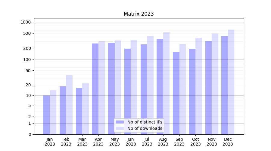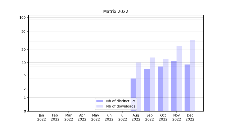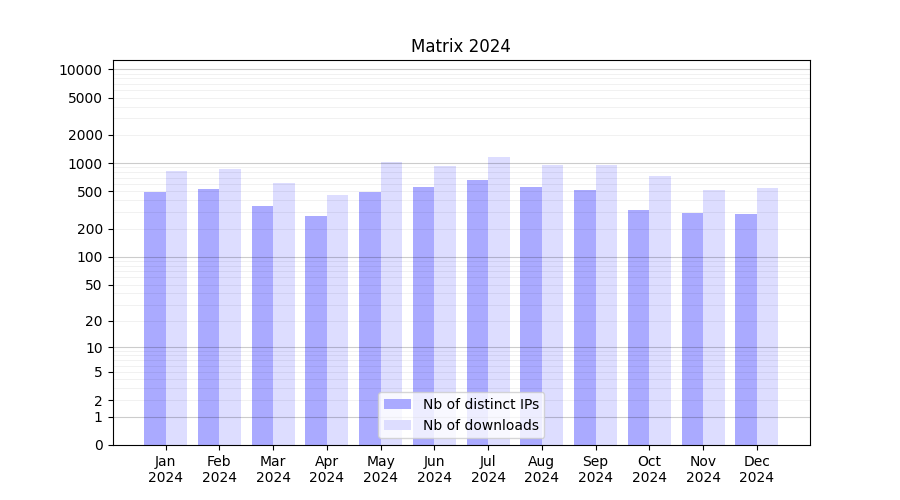 Number of downloads for experiment package Matrix, year by year, from 2025 back to 2014 (years with no downloads are omitted):