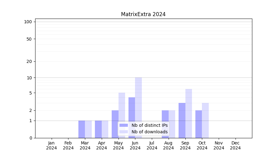 Number of downloads for experiment package MatrixExtra, year by year, from 2025 back to 2014 (years with no downloads are omitted):