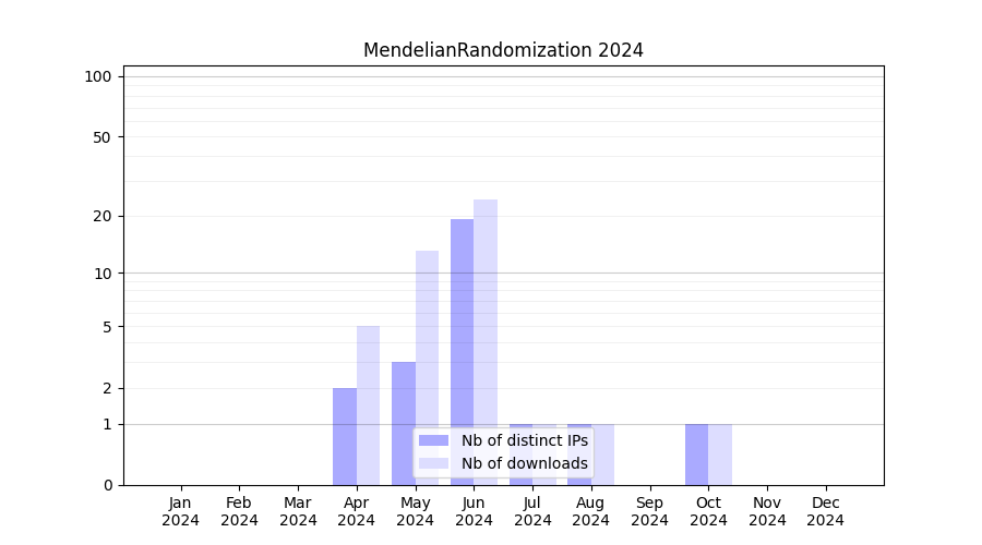 Number of downloads for experiment package MendelianRandomization, year by year, from 2025 back to 2014 (years with no downloads are omitted):