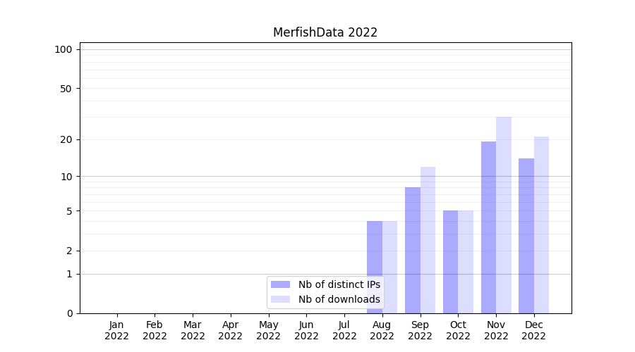 Number of downloads for experiment package MerfishData, year by year, from 2025 back to 2014 (years with no downloads are omitted):