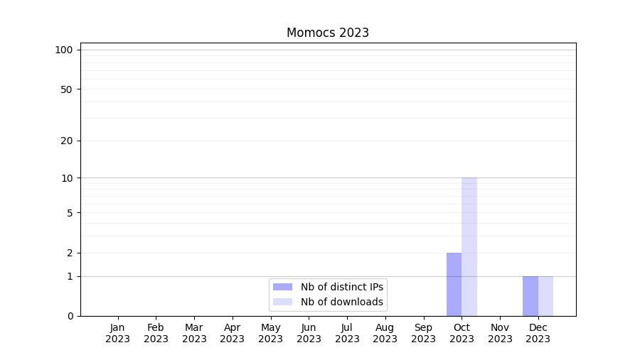Number of downloads for experiment package Momocs, year by year, from 2025 back to 2014 (years with no downloads are omitted):