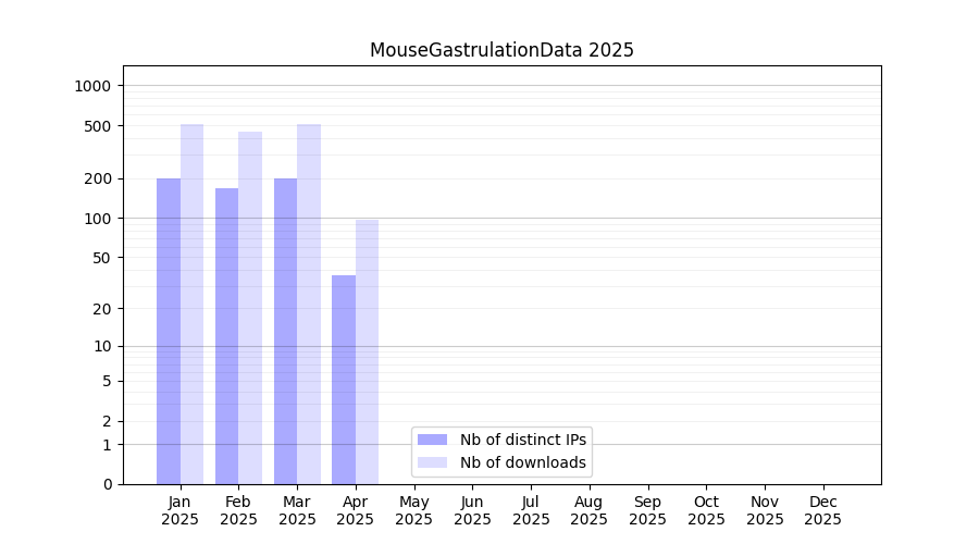Number of downloads for experiment package MouseGastrulationData, year by year, from 2025 back to 2014 (years with no downloads are omitted):