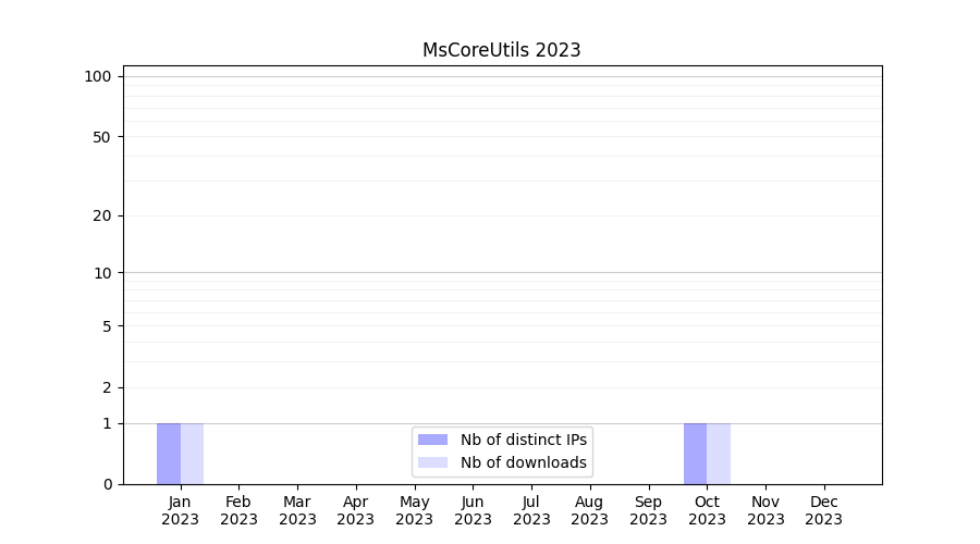 Number of downloads for experiment package MsCoreUtils, year by year, from 2025 back to 2014 (years with no downloads are omitted):
