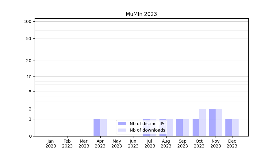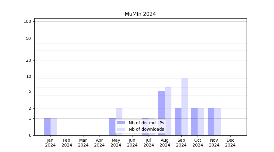 Number of downloads for experiment package MuMIn, year by year, from 2025 back to 2014 (years with no downloads are omitted):