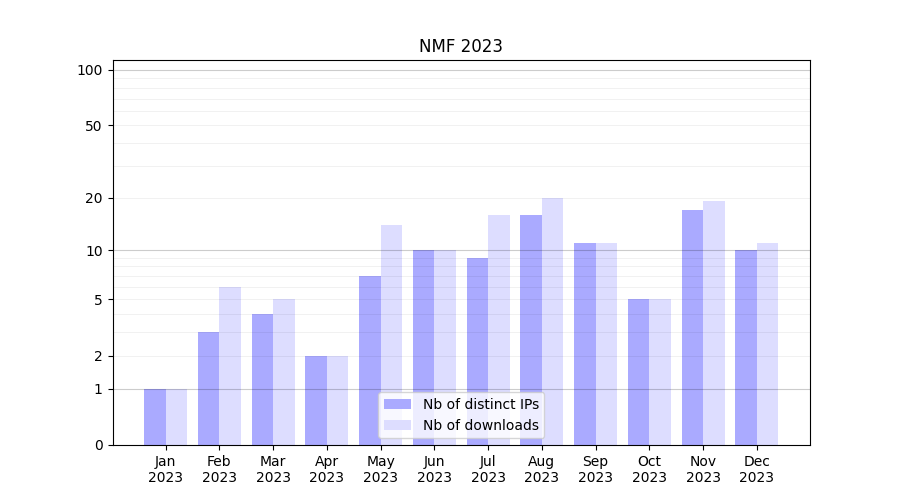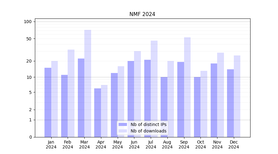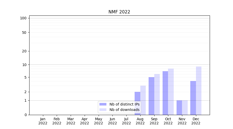 Number of downloads for experiment package NMF, year by year, from 2025 back to 2014 (years with no downloads are omitted):