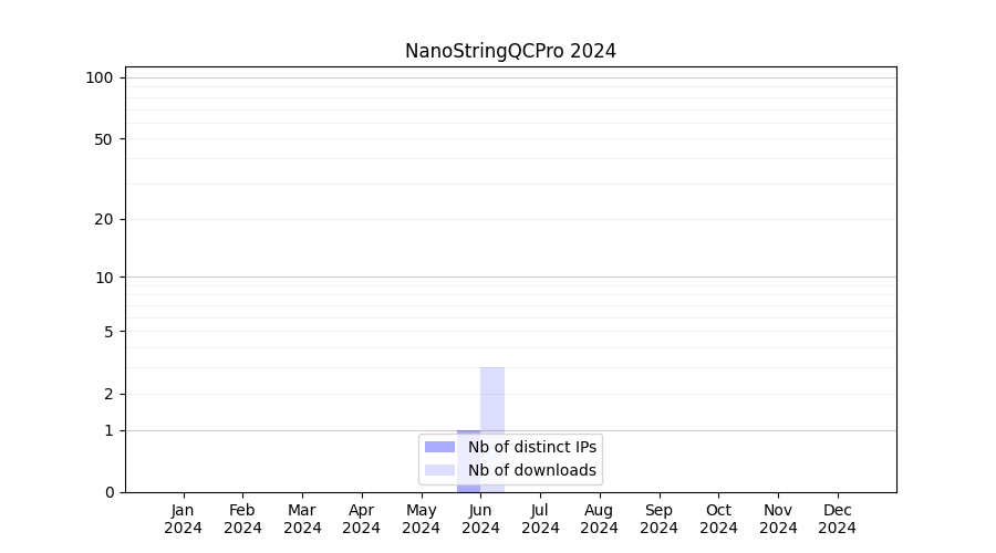 Number of downloads for experiment package NanoStringQCPro, year by year, from 2025 back to 2014 (years with no downloads are omitted):