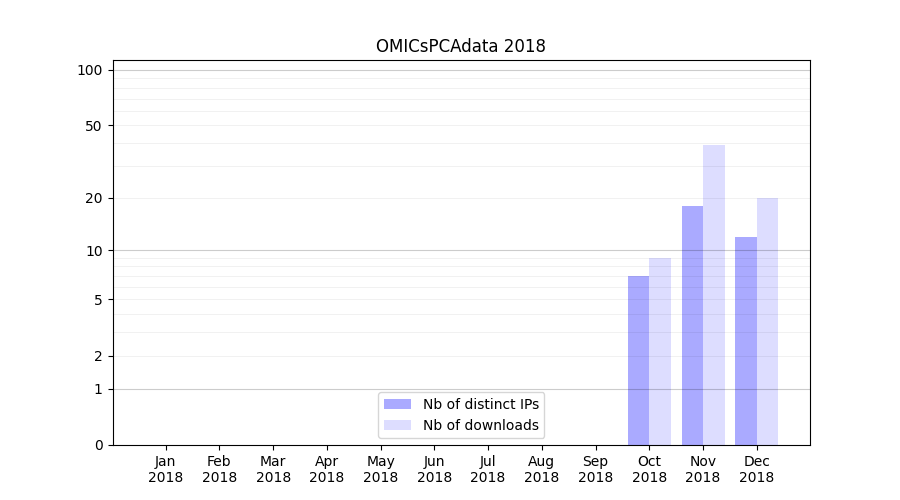 Number of downloads for experiment package OMICsPCAdata, year by year, from 2025 back to 2014 (years with no downloads are omitted):