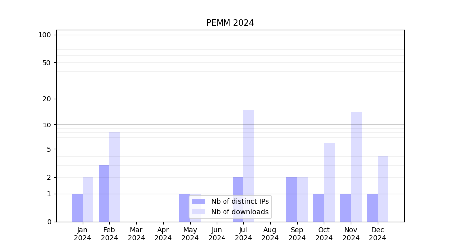 Number of downloads for experiment package PEMM, year by year, from 2025 back to 2014 (years with no downloads are omitted):