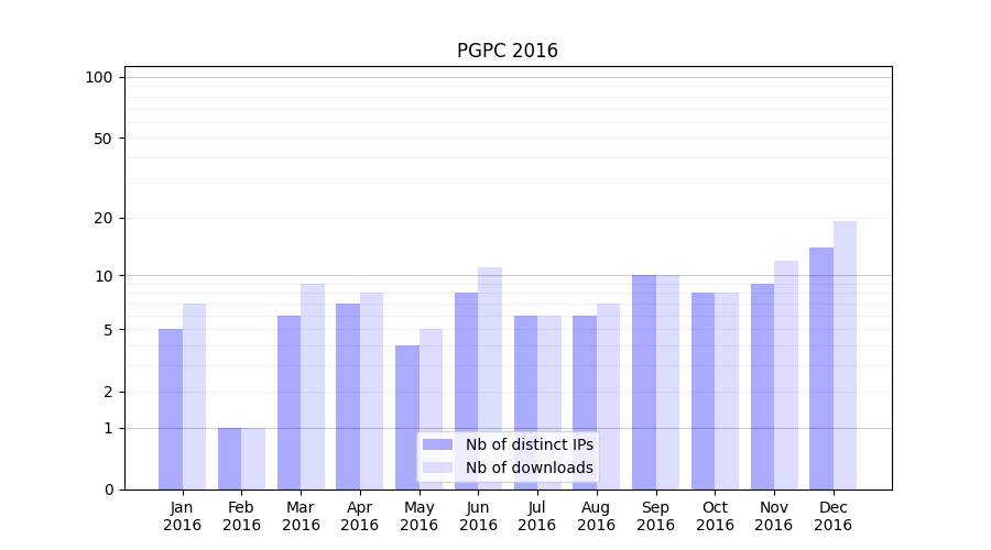 Number of downloads for experiment package PGPC, year by year, from 2025 back to 2014 (years with no downloads are omitted):