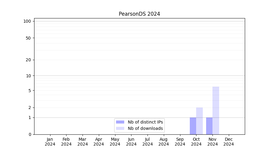 Number of downloads for experiment package PearsonDS, year by year, from 2025 back to 2014 (years with no downloads are omitted):