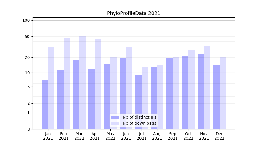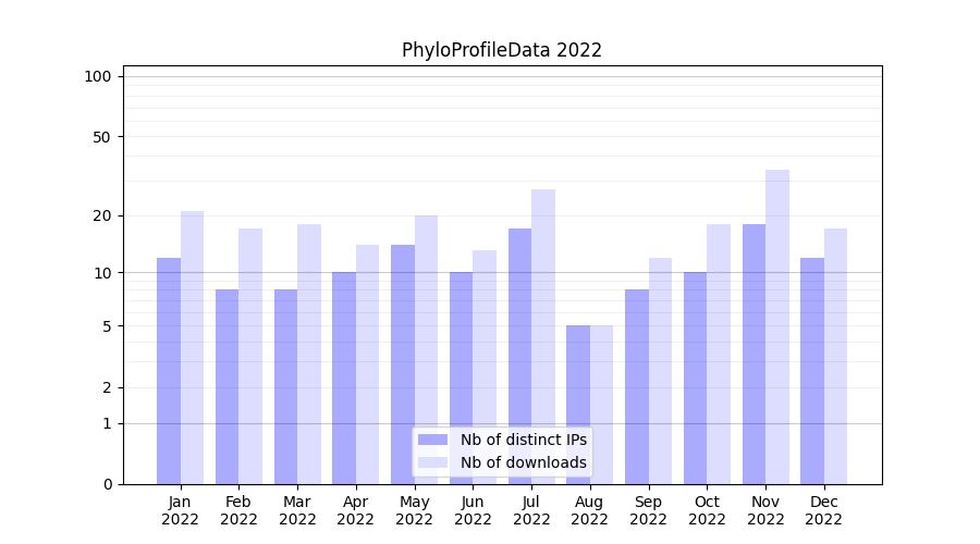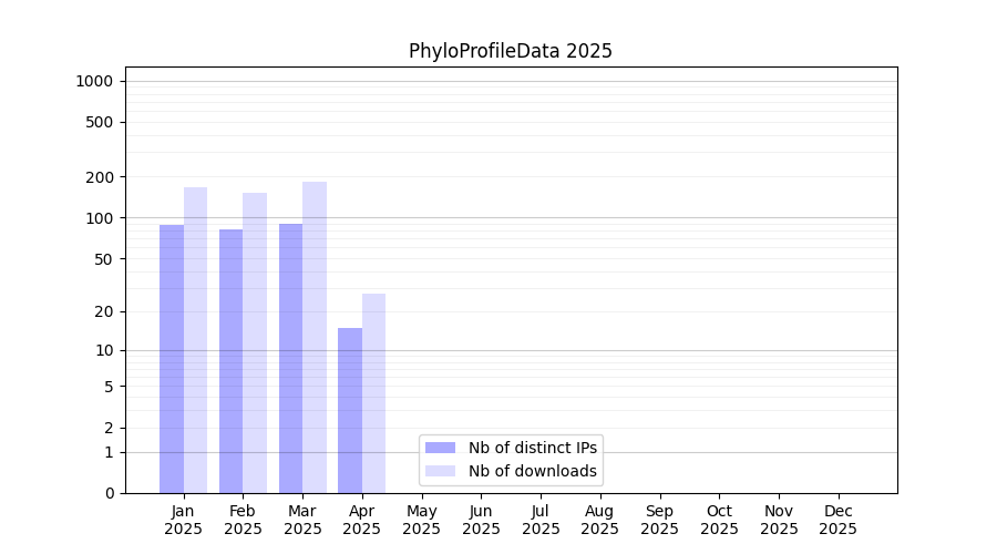 Number of downloads for experiment package PhyloProfileData, year by year, from 2025 back to 2014 (years with no downloads are omitted):