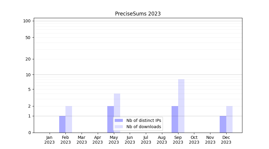 Number of downloads for experiment package PreciseSums, year by year, from 2025 back to 2014 (years with no downloads are omitted):