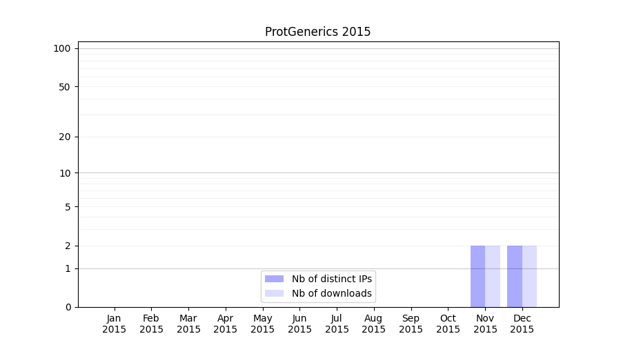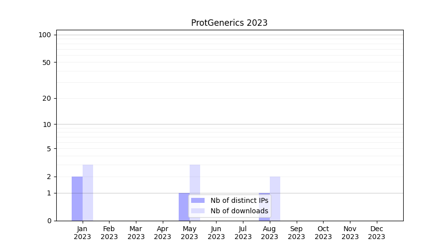 Number of downloads for experiment package ProtGenerics, year by year, from 2025 back to 2014 (years with no downloads are omitted):
